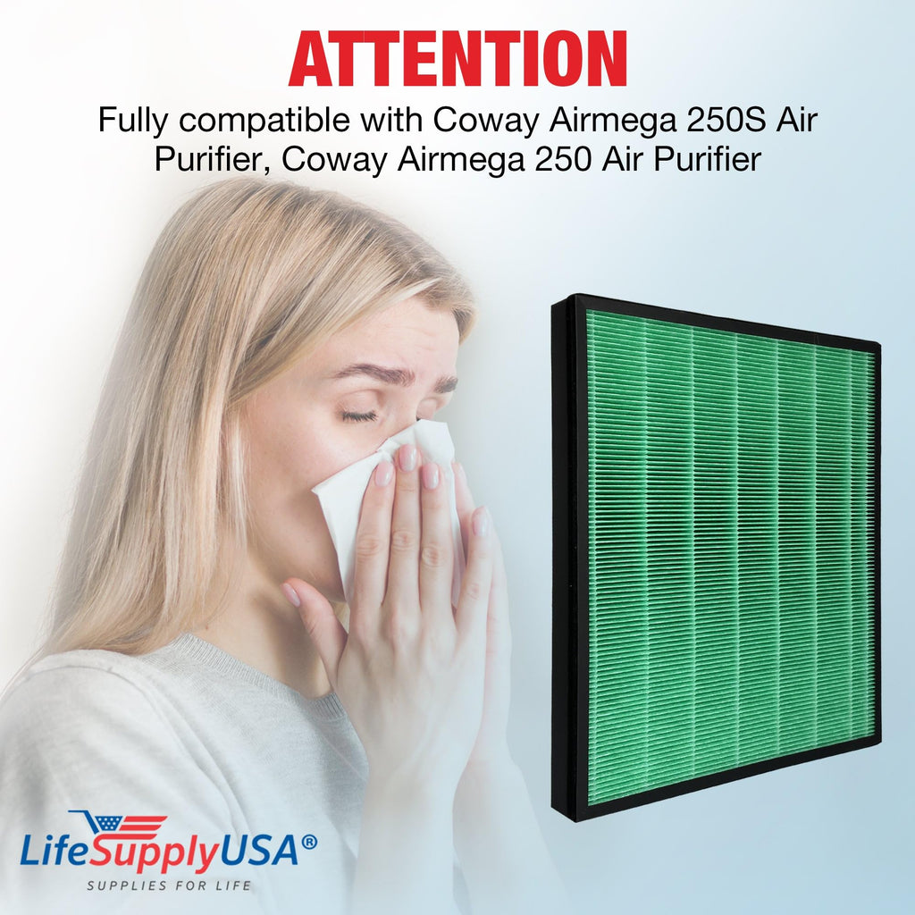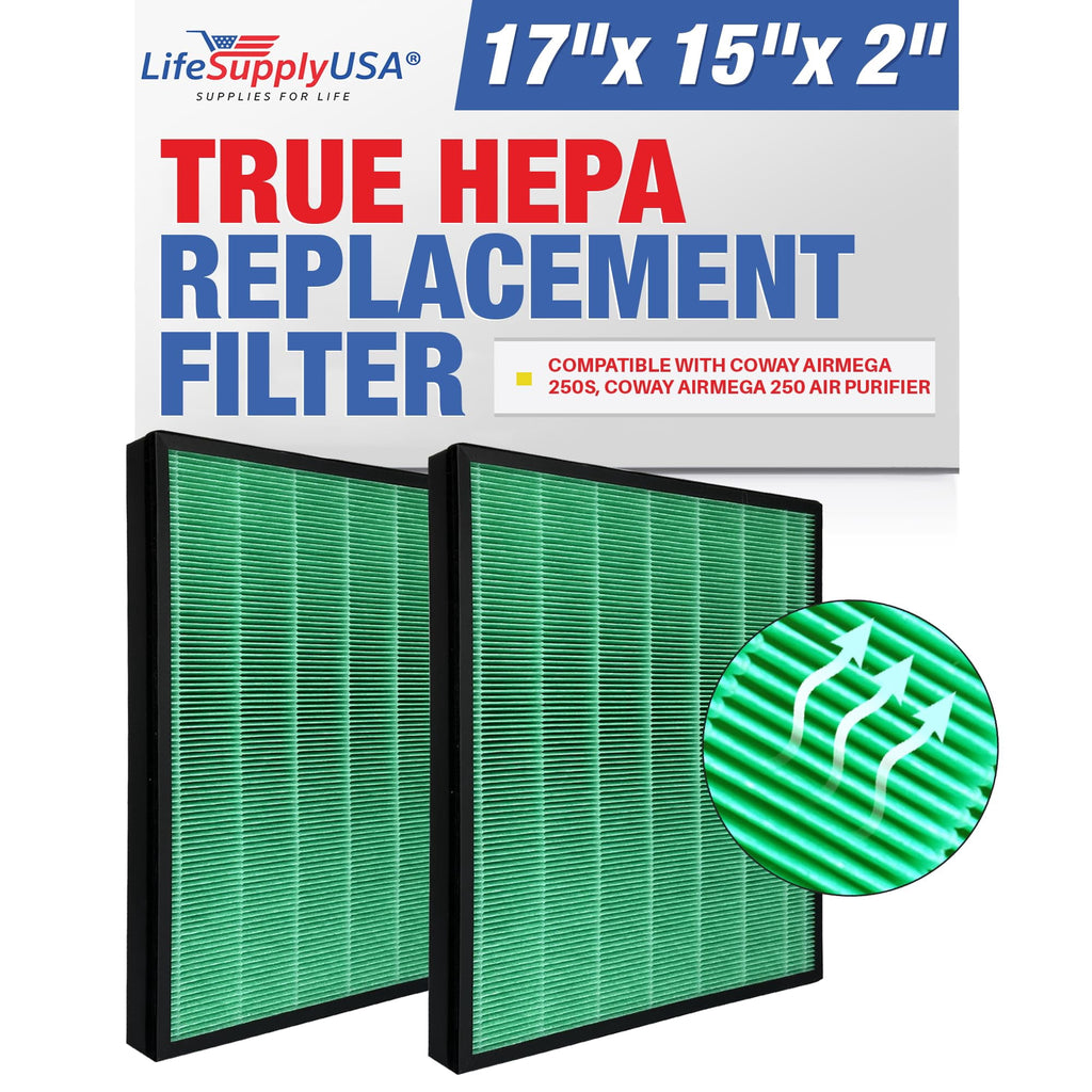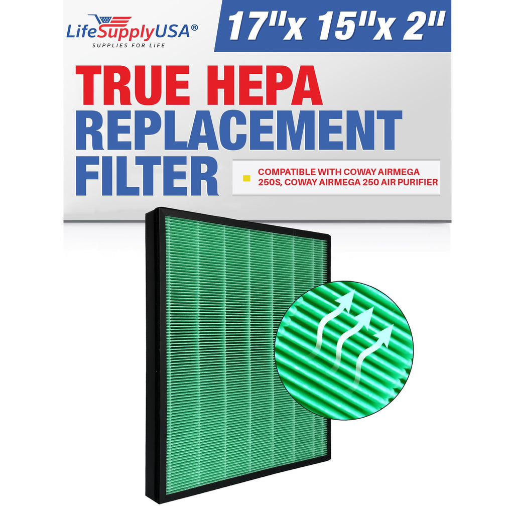 - Effective Air Filtration: Includes a True HEPA filter to capture airborne particles and improve indoor air quality. Approximate dimensions: 17" x 15" x 2".,Compatible Design: Designed to fit Coway Airmega 250S Air Purifier, Coway Airmega 250 Air Purifier. This is a replacement filter by LifeSupplyUSA, not an OEM product.,Efficient Air Filtration: True HEPA filter captures fine particles and allergens. Reduces odors from cooking and smoke for fresher indoor air.,Durable and Efficient: LifeSupplyUSA air purifier filters are built to maintain optimal airflow and support the longevity of your air purifier.,Hassle-Free Installation: Installs easily without tools. Replace every 6 months, depending on usage and air quality, to maintain optimal performance.