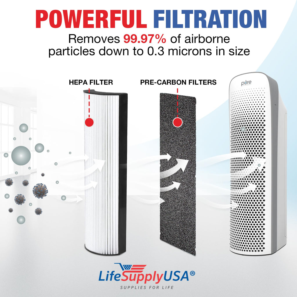 - Excellent Value: Replacement filter set for air purifiers, effectively filters air particles for healthier living. Dimensions: 2.75" x 1.5" x 17.75" inches,Compatibility: Compatible with PureZone PEAIRTWR Elite Tower. Not OEM; exclusively by LifeSupplyUSA.,High-Quality Air Filtration: High-Efficiency Particulate Air (HEPA) design filters fine particles and irritants. Carbon extends HEPA filter life and removes larger particles. Also eliminates cooking odors and smoke for improved indoor air quality.,Professional Grade: LifeSupplyUSA Air Purifier Filters are designed to be durable and efficient, ensuring maximum airflow and protecting your device.,Easy Installation: Tool-free installation; simply remove and replace from your air purifier unit when needed. For best results, replace the filter every 6 months (depending on air quality and usage).