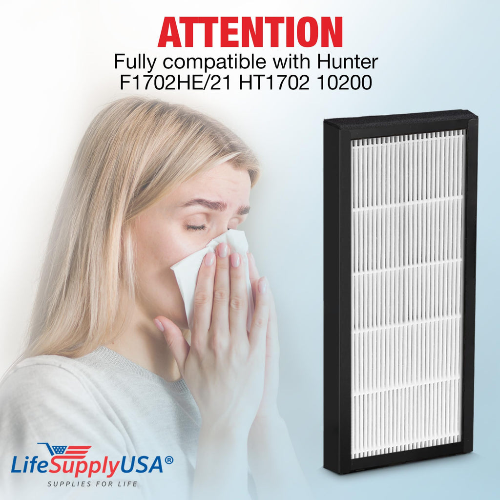 - Excellent Value: Replacement filter set for air purifiers, effectively filters air particles for healthier living. Dimensions: 11.61" x 5" x 1.26" inches,Compatibility: Compatible with Hunter F1702HE/21 HT1702 10200. Not OEM; exclusively by LifeSupplyUSA.,High-Quality Air Filtration: High-Efficiency Particulate Air (HEPA) design filters fine particles and irritants. Carbon extends HEPA filter life and removes larger particles. Also eliminates cooking odors and smoke for improved indoor air quality.,Professional Grade: LifeSupplyUSA Air Purifier Filters are designed to be durable and efficient, ensuring maximum airflow and protecting your device.,Easy Installation: Tool-free installation; simply remove and replace from your air purifier unit when needed. For best results, replace the filter every 6 months (depending on air quality and usage).