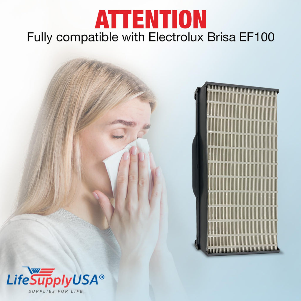 - Excellent Value: Replacement filter for air purifiers, effectively filters air particles for healthier living. Dimensions: 9" x 4" x 16.75" inches,Compatibility: Compatible with Electrolux Brisa EF100. Not OEM; exclusively by LifeSupplyUSA.,Quality HEPA Filtration: High-Efficiency Particulate Air (HEPA) design filters fine particles and irritants.,Professional Grade: LifeSupplyUSA Air Purifier Filters are designed to be durable and efficient, ensuring maximum airflow and protecting your device.,Easy Installation: Tool-free installation; simply remove and replace from your air purifier unit when needed. For best results, replace the filter every 6 months (depending on air quality and usage).