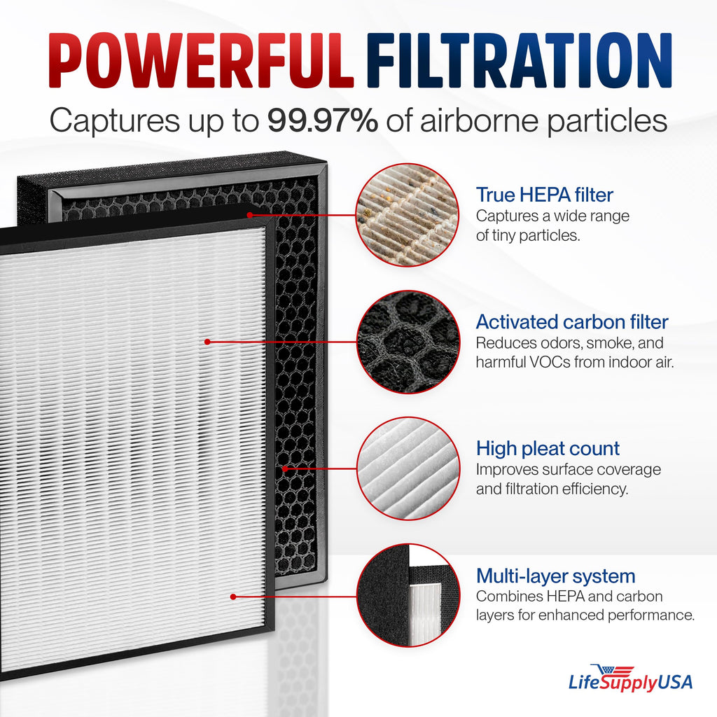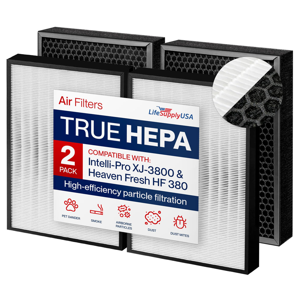 - Improve your indoor air quality with this high-performance True HEPA and Activated Carbon replacement filter by LifeSupplyUSA. Specifically designed for compatibility with Surround Air Intelli-Pro XJ-3800 and Heaven Fresh HF 380 air purifiers, this 2-in-1 filter set provides professional-grade filtration for your home or office. The High-Efficiency Particulate Air (HEPA) layer is engineered to capture 99.97% of fine airborne particles and irritants, including dust, pollen, and pet dander. Complementing the HEPA filtration, the integrated Activated Carbon layer effectively neutralizes cooking odors, smoke, and volatile organic compounds (VOCs) while extending the overall life of the HEPA filter. Built for durability and maximum airflow, these filters ensure your device operates at peak efficiency. Installation is quick and tool-free; simply remove your old filter and slide in the new one. For optimal performance and a healthier living environment, it is recommended to replace your filter every 6 to 12 months depending on usage and air quality. Product Highlights: - Compatibility: Fits Surround Air Intelli-Pro XJ-3800 Series and Heaven Fresh HF 380. - Dual-Stage Filtration: Combines True HEPA for particles and Activated Carbon for odors. - Dimensions: Approximately 13.11 x 11.02 x 1.18 inches. - Flexible Options: Available in various pack sizes to suit your maintenance needs. - Quality Assured: High-quality, non-OEM replacement part by LifeSupplyUSA.