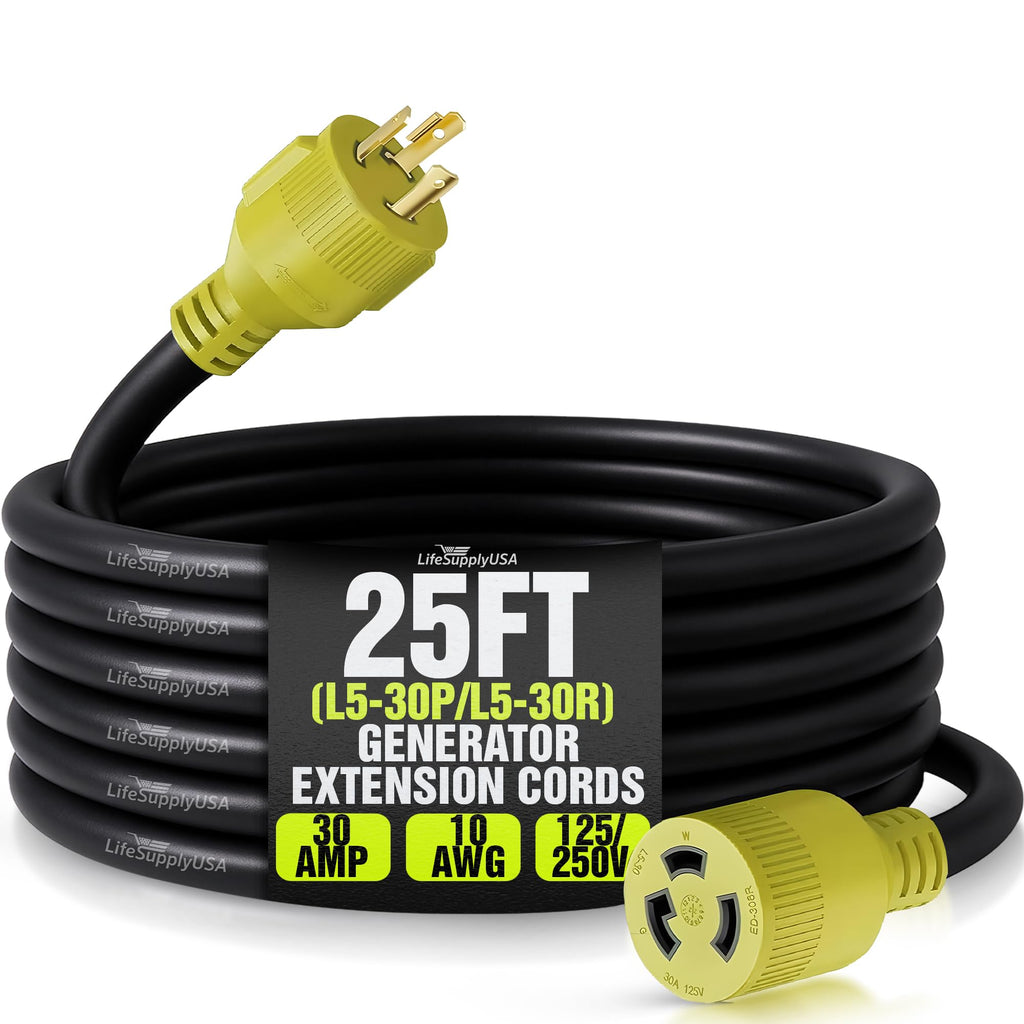 25ft Generator Extension Cord 30 AMP 3-Prong (L5-30P/L5-30R) - 10AWG3 125/250V STW - Hook and Loop Strap ETL Listed by LifeSupplyUSA