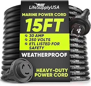 - The LifeSupplyUSA Marine Power Cord is designed to provide reliable and durable shore power connections for your boat, offering a robust solution for all your marine electrical needs. With its 30 AMP capacity and heavy-duty construction, this cord ensures consistent power delivery to keep your boat’s systems running smoothly. The length offers plenty of reach, making it easier to connect to shore power sources when docking. A lighted connector at the end of the cord helps you quickly confirm when the power is active, ensuring a secure connection, even in low-light or nighttime conditions. Designed specifically for marine environments, this cord is equipped with a rugged, weatherproof jacket that resists saltwater, moisture, and UV damage, ensuring long-lasting durability. The twist-lock design ensures a secure connection that won’t accidentally disconnect, even in rough waters or challenging docking conditions. ETL listed for safety, this marine power cord meets rigorous industry standards for performance and reliability. Its corrosion-resistant materials ensure that it can withstand the harsh conditions commonly found in marine settings, making it the perfect choice for boat owners who need a durable, dependable shore power connection. Whether you're docking for the night or connecting to shore power for extended stays, the LifeSupplyUSA Marine Power Cord offers the strength, reliability, and convenience you need for safe and effective power delivery.
