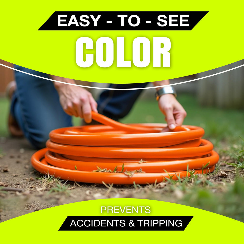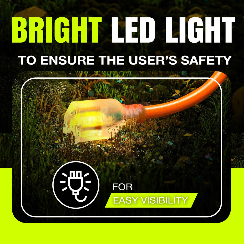 LIGHTED END FOR VISIBILITY & SAFETY: With a lighted end to indicate power and a brightly colored PVC jacket, this three prong extension cord minimizes tripping hazards and improves safety in busy or poorly lit areas. Stay safe while powering up with an easily noticeable extension cable. The innovative design not only enhances operational safety but also ensures that the indoor / outdoor power cord is easily identifiable among your tools and equipment, preventing accidental disconnections.