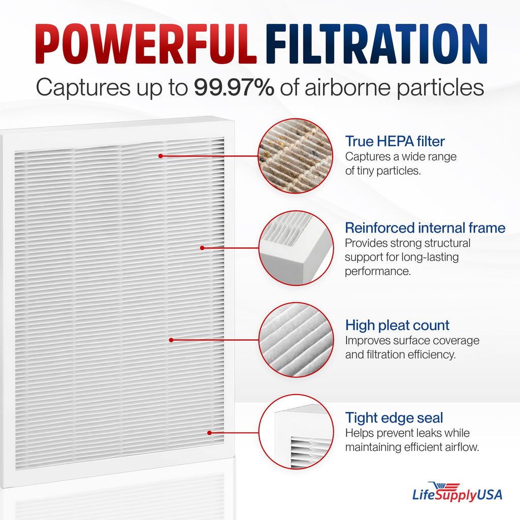 - Improve the air quality in your home or office with these high-quality True HEPA replacement filters by LifeSupplyUSA. Specifically designed to provide professional-grade filtration, these filters effectively capture fine airborne particles and irritants, ensuring a healthier living environment and maximum airflow for your device. Each filter is sealed for freshness and built for durability, offering an excellent value for maintaining your air purifier's peak performance. These replacements are available in various pack sizes to suit your maintenance needs. For optimal results, it is recommended to replace your filter every 6 months, depending on usage and local air quality. Choose LifeSupplyUSA for a reliable, tool-free installation solution that protects your family and your investment.